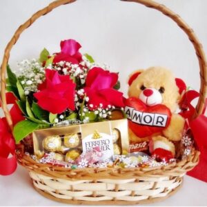 Cesta de aniversário com rosas e chocolates
