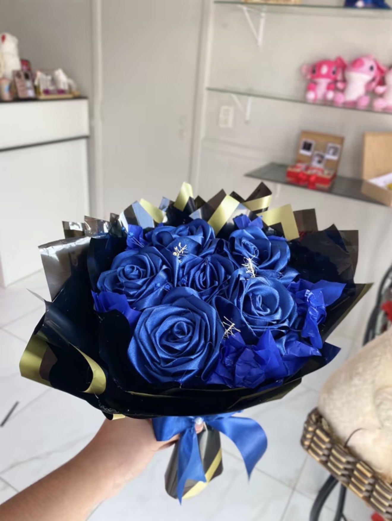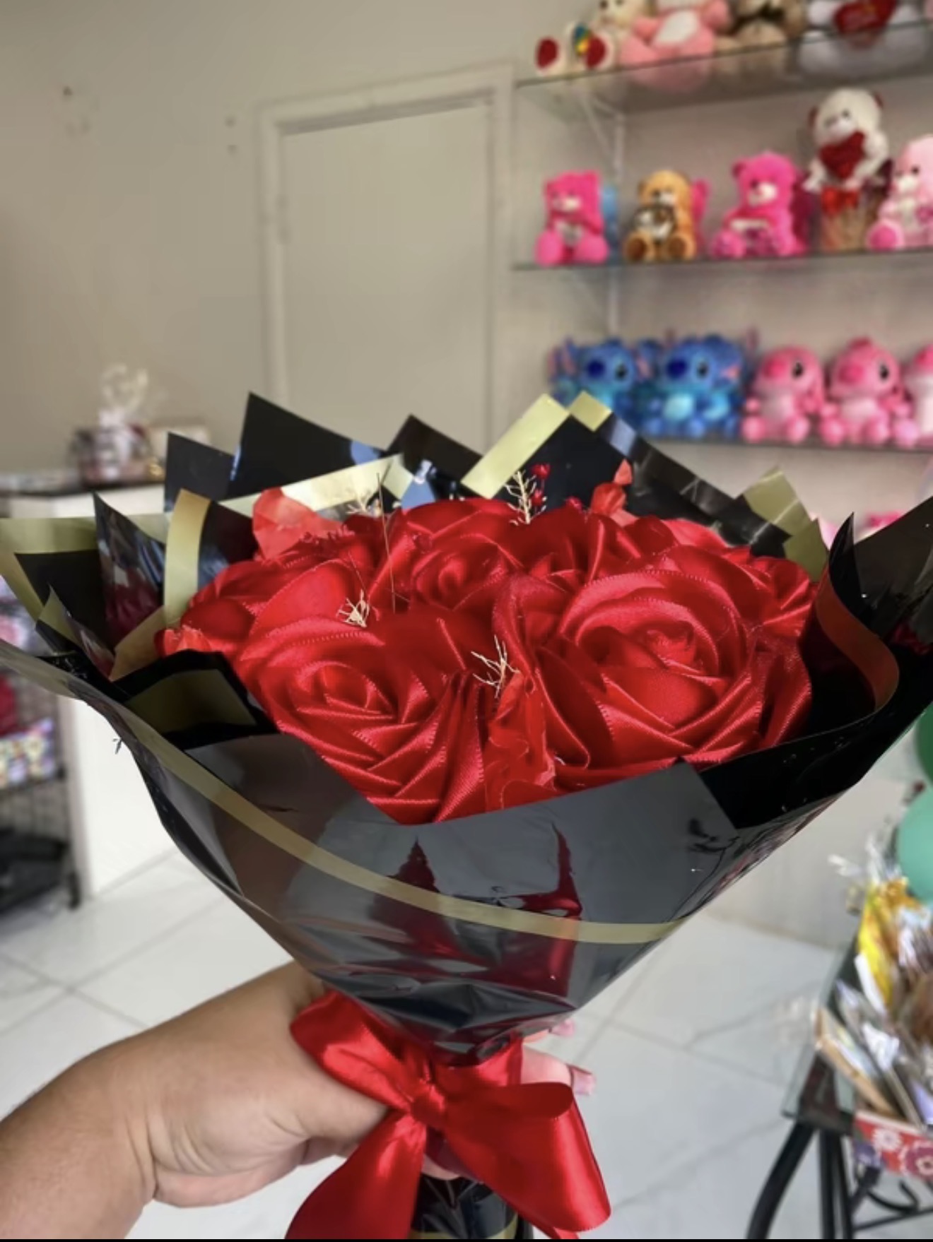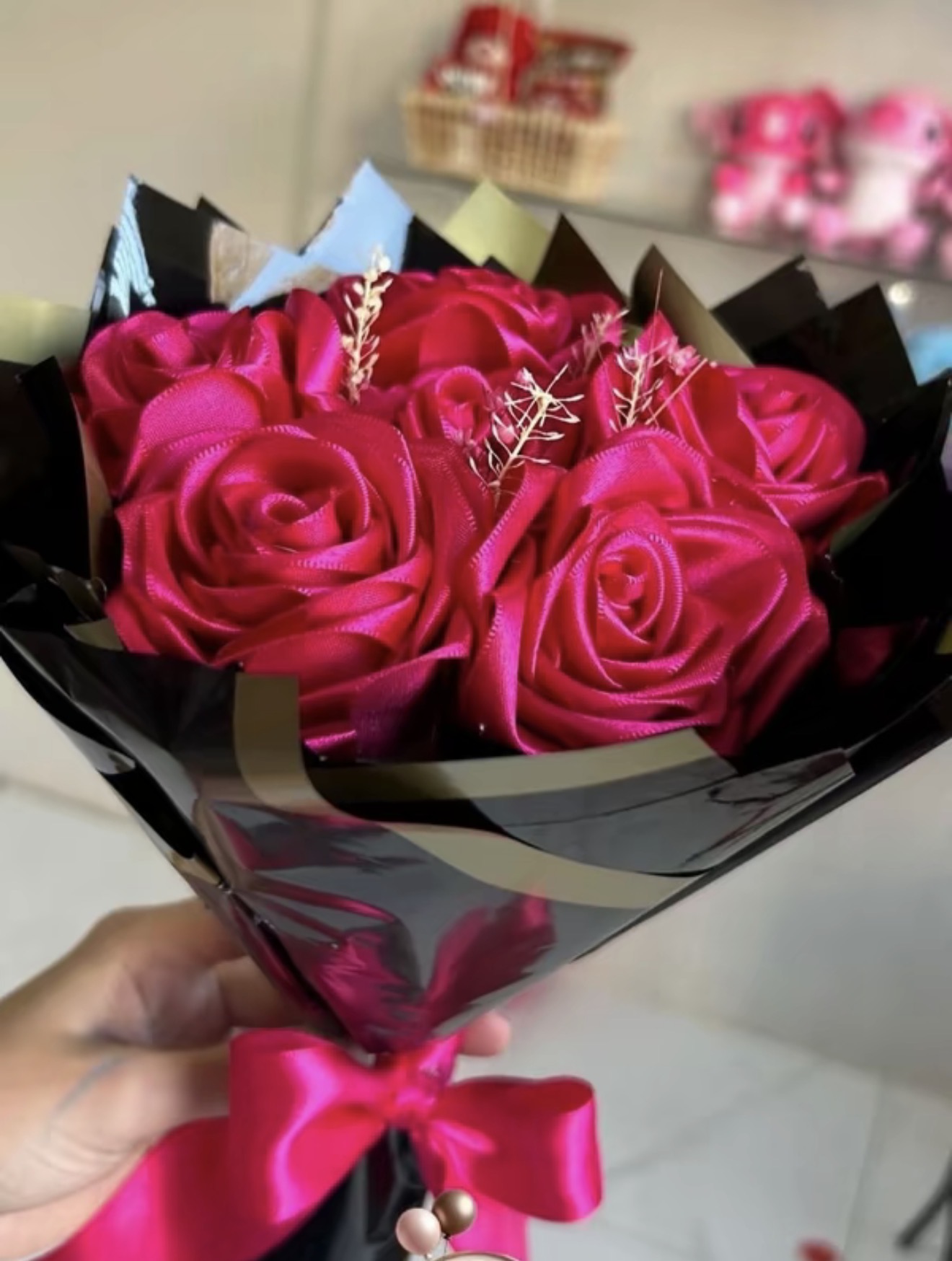 Buque de 6 rosas de cetim com laco para presente elegante e romantico quantidade
