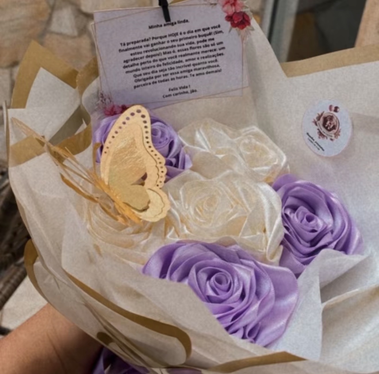 Buque de 6 rosas de cetim com laco para presente elegante e romantico