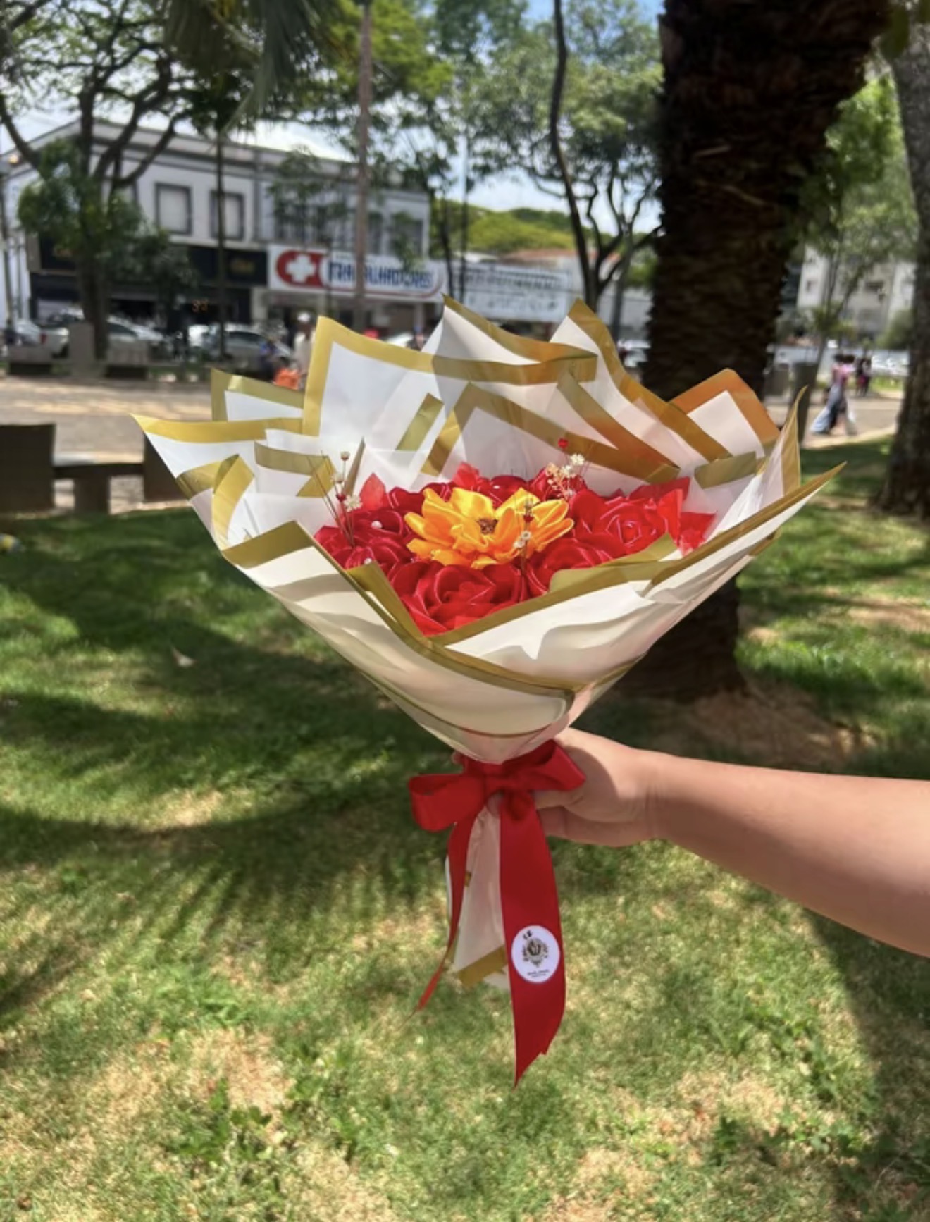 Buquê Girassol com Rosas Vermelhas