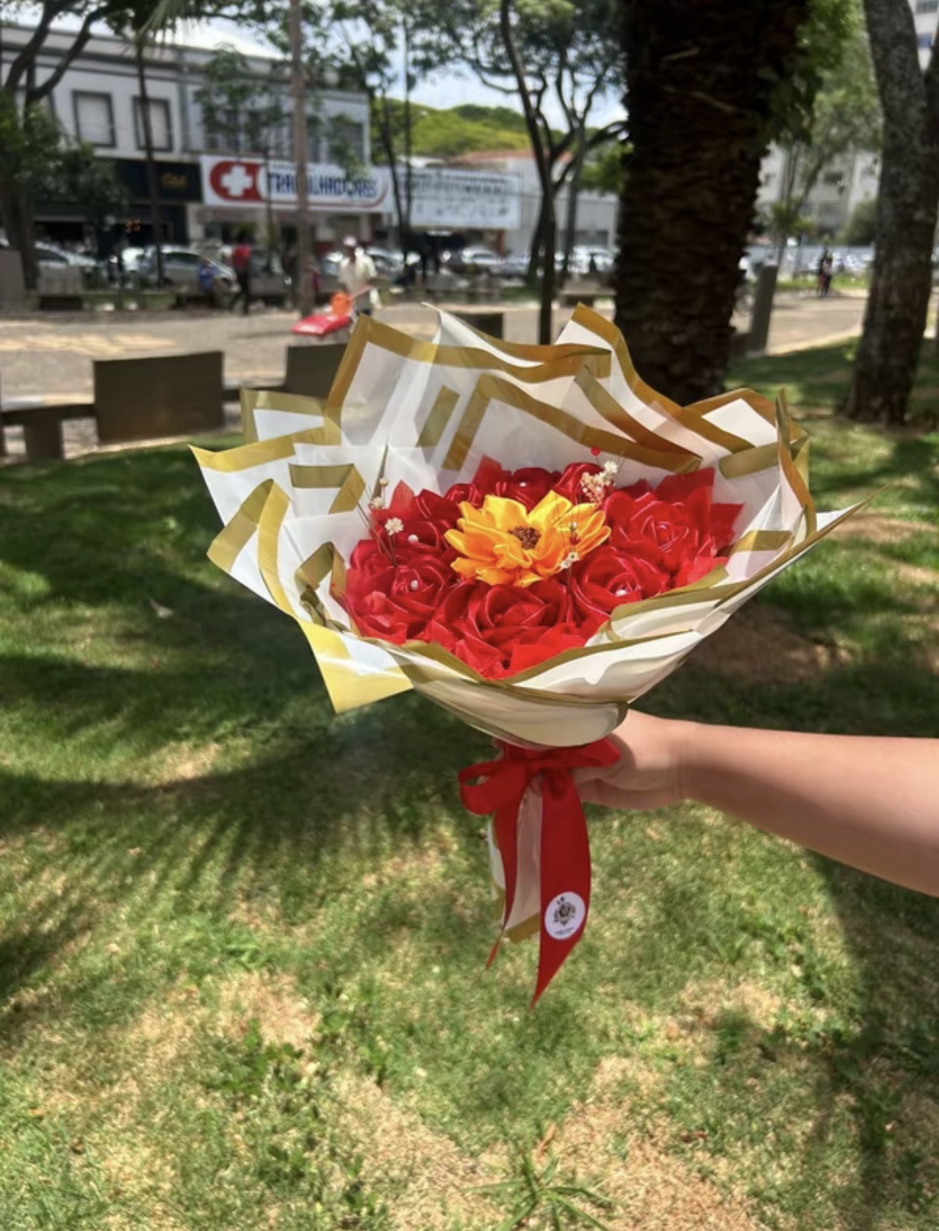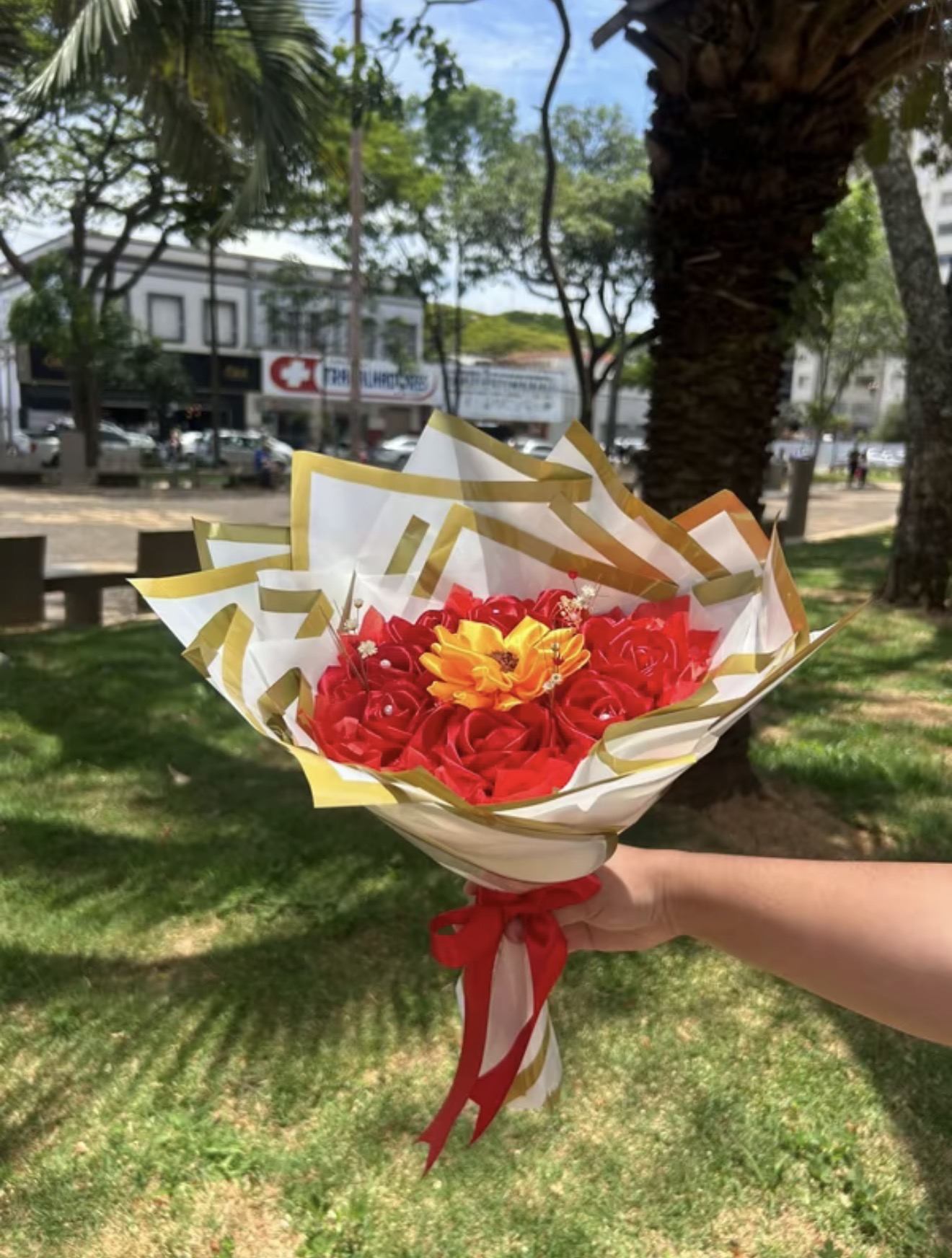 Buque de 8 rosas de cetim com 1 girassol e perolas